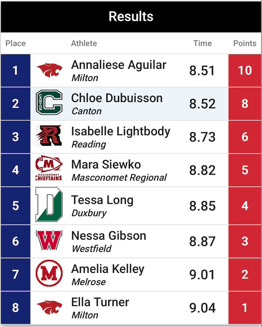 At the Massachusetts Division 3 State Championship, Long placed fifth in the 55 meter hurdles with a time of 8.85 seconds. The finish put her among the top hurdlers in the state and rewrote her own school record in the process.